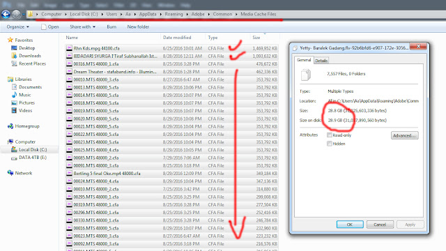 Setelah membersihkan semua file sampah itu, coba cek lagi direktori file (seperti yang di garis bawahi merah) dan lihat! Besar filenya hingga bergiga-giga, dan totalnya puluhan, bahkan ada yang ratusan (lebih dari 100 GB).